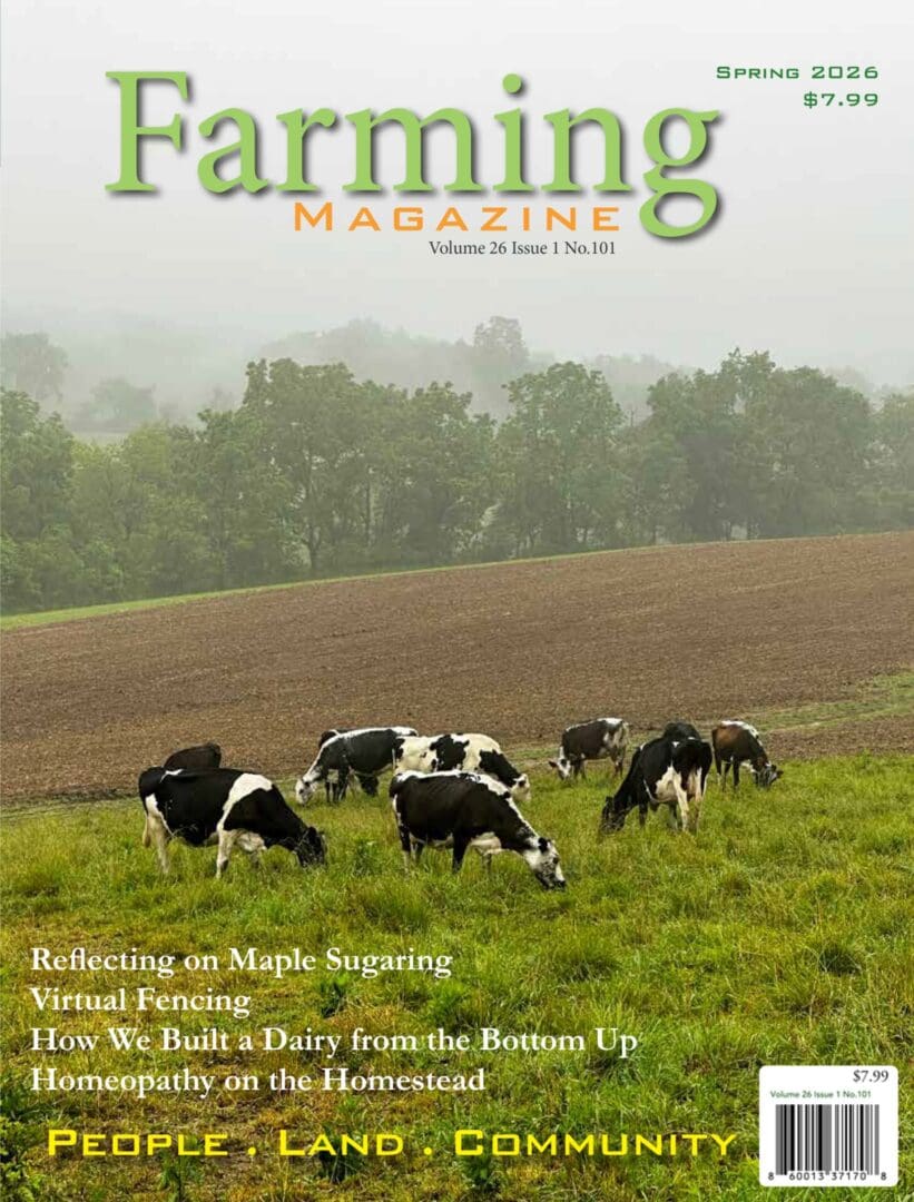 Spring 2026 issue of Farming Magazine—People land and community, promoting sustainable farming practices. Focusing on raising sheep, keeping bees, dairy cows, gardening and more.