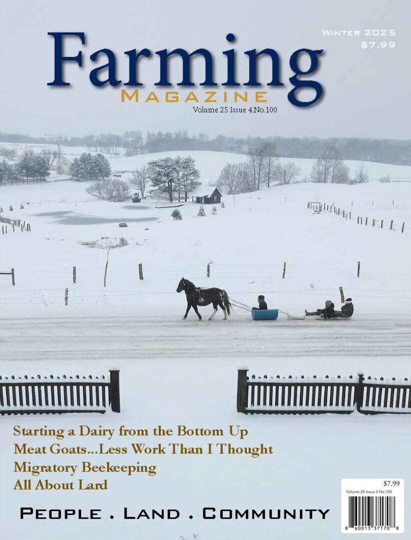 Winter 2025 issue of Farming Magazine—People land and community, promoting sustainable farming practices. Focusing on raising sheep, keeping bees, dairy cows, gardening and more.